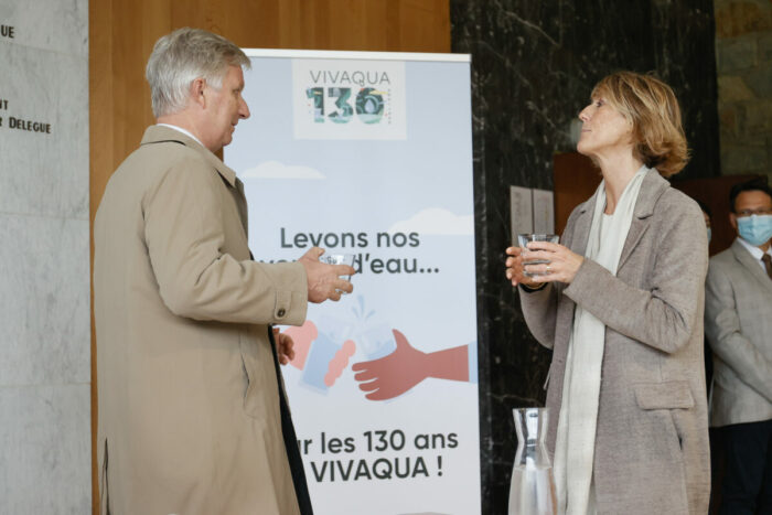 BELGALaurence Bovy, nouvelle présidente de la SFPI. Elle est ici en présence avec le roi Philippe lors d’une visite royale sur le site production d’eau potable de Vivaqua (dont elle est la patronne) à Tailfer à Lustin.