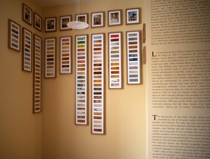 Au-delà du film, des plans et des textes, il s’agissait également de donner une certaine matérialité à cette histoire. Grâce à la création de nuanciers thématiques exprimant les riches palettes de couleurs et de textures du musée, le visiteur peut mieux visualiser les gammes utilisées par Horta et le raffinement de la maison.