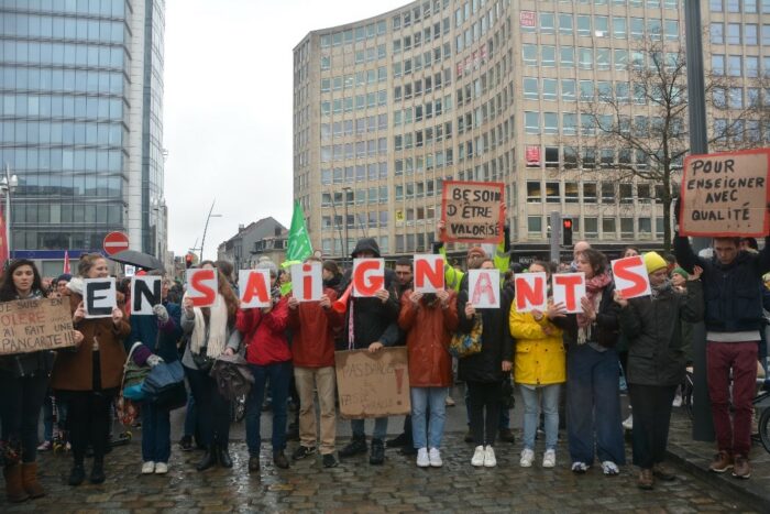 Dès 10h, place Surlet de Chokier, certains enseignants sont déjà là. Le ciel gris et la bruine qui trempe les premiers arrivés n’a pas réussi à les démotiver. Le personnel enseignant répond à l’appel à la grève lancé par les principaux syndicats du secteur de l’enseignement. L’objectif ? Être sous les fenêtres de la Fédération Wallonie-Bruxelles pour être sûr que les ministres de l’Education, Caroline Désir (PS) et la ministre de l’Enseignement supérieur, Valérie Glatigny (MR) entendent bien les revendications de la foule.
