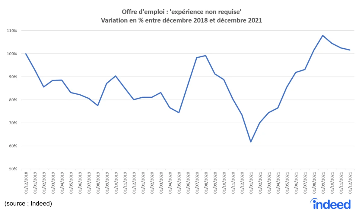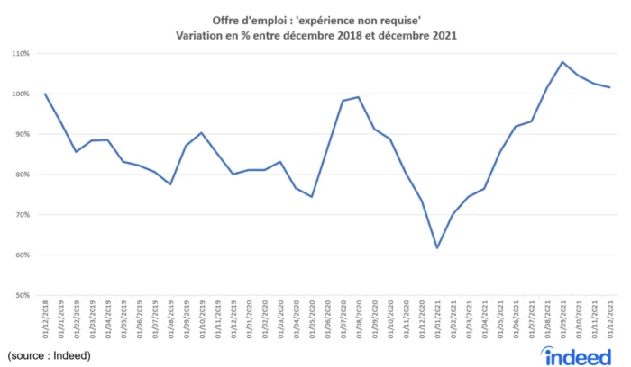 Fin 2021, enfin, après une année complète soumise aux mesures sanitaires, mais aussi après un rétablissement progressif du marché du travail aux niveaux prépandémiques, près de 40 % d’offres d’emploi de plus comparé à l’année précédente indiquaient clairement que l’expérience n’était pas requise.
