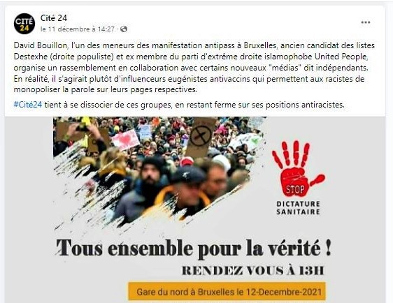 En date du 11 décembre 2021, Fayçal Cheffou relaie le texte suivant : « David Bouillon, l’un des meneurs des manifestation anti-pass à Bruxelles, ancien candidat des listes Destexhe (droite populiste) et ex-membre du parti d’extrême droite islamophobe United People, organise un rassemblement en collaboration avec certains nouveaux « médias » dit indépendants. En réalité, il s’agirait plutôt d’influenceurs eugénistes antivaccins qui permettent aux racistes de monopoliser la parole sur leurs pages respectives. #Cité24 tient à se dissocier de ces groupes, en restant ferme sur ses positions antiracistes. »