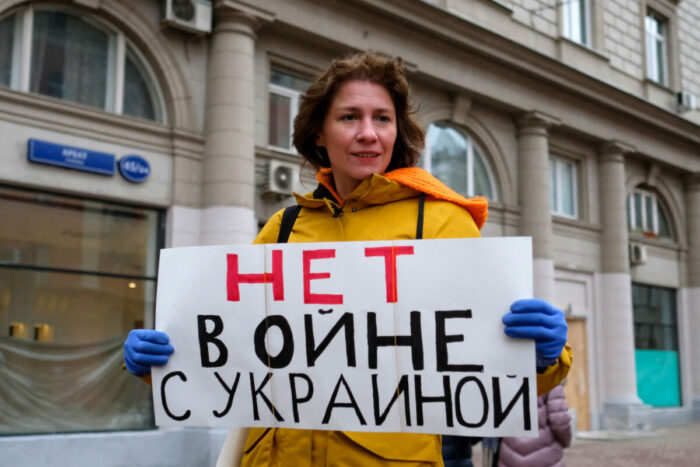 Une femme tenant une pancarte indiquant « Non à la guerre avec l’Ukraine » organise un piquet à Moscou le 23 février 2022. (Photo de Nikolay KORZHOV / AFP)