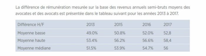 Toujours selon cette étude, les avocats perçoivent en moyenne annuelle une rémunération double ou quasiment double de celle perçue par les avocates. En retenant l’hypothèse moyenne médiane, les avocates ont ainsi perçu en 2017 56% du revenu annuel semi-brut moyen médian perçu par les avocats, soit un écart de 44%.