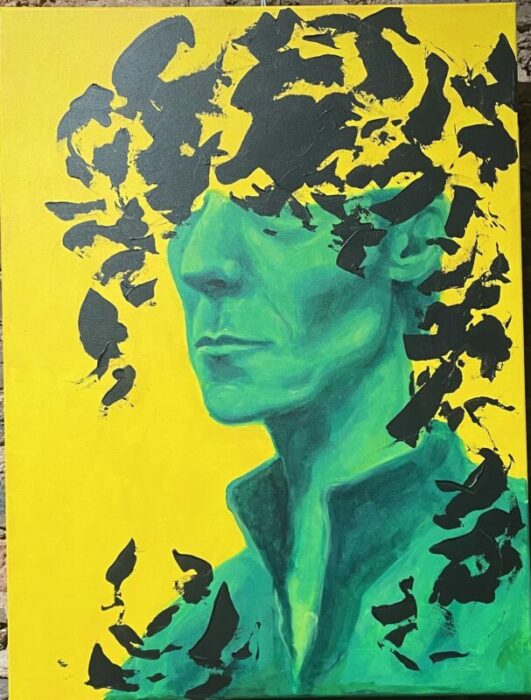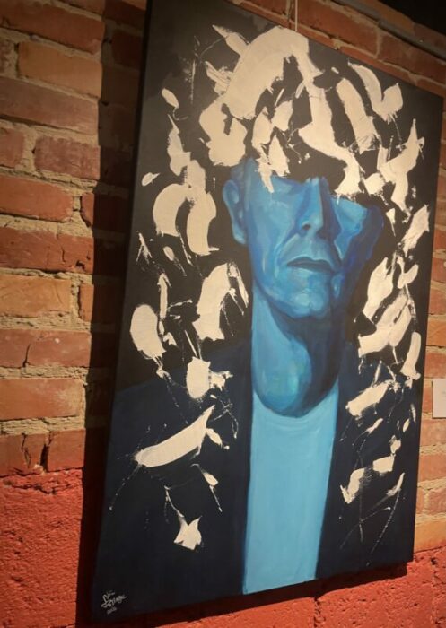 L’œuvre servant d’attrait à cette exposition, présentée jusqu’à la fin du mois, au cœur du parc de la Boverie, impressionne d’entrée de jeu. On y reconnaît, le visage anguleux de Bowie, rendu fantasmagorique. Le chanteur disparu ne nous observe pas réellement et pourtant, il se dégage du tableau, une présence hors du commun. Bienvenue dans l’univers sans regard de Loïc Pallage.