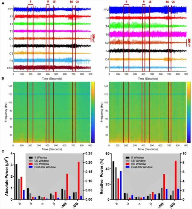 Dans le cadre d’une étude Enhanced Interplay of Neuronal Coherence and Coupling in the Dying Human Brain (Link vers: https://www.frontiersin.org/articles/10.3389/fnagi.2022.813531/full), les neuroscientifiques américains surveillaient l’activité cérébrale d’un patient épileptique de 87 ans qui a soudainement eu une crise cardiaque. Cela leur a permis de capter l’activité cérébrale au moment du décès. Et ce qu’ils ont enregistré comparativement, 30 secondes avant l’arrêt du cœur et 30 secondes après, est une activité accrue des ondes gamma.