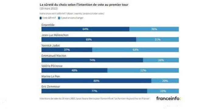 Les électeurs de Marine Le Pen sont ceux qui sont les plus sûrs de leur choix : 80% affirment que leur intention de vote est définitive. Ils sont 77% pour Éric Zemmour et 74% pour le candidat-président Emmanuel Macron. Jean-Luc Mélenchon affiche, pour sa part, un taux de 69%. Chez les électeurs de Valérie Pécresse, 52% estiment pouvoir encore changer d’avis. C’est encore plus prononcé pour Yannick Jadot (63%).