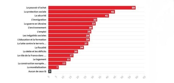 Semaine après semaine, la hiérarchie des enjeux pour la campagne se confirme. Le pouvoir d’achat reste l’enjeu le plus cité par les Français : il comptera dans le vote de 63 % d’entre eux, soit une hausse de 4 points en une semaine. La question de la protection sociale connaît une hausse de 3 points (48 %), alors que la question du recul de l’âge de la retraite a été abordée par le candidat Emmanuel Macron. La guerre en Ukraine est citée par 28 % des Français, en retrait de 4 points depuis la semaine précédente.