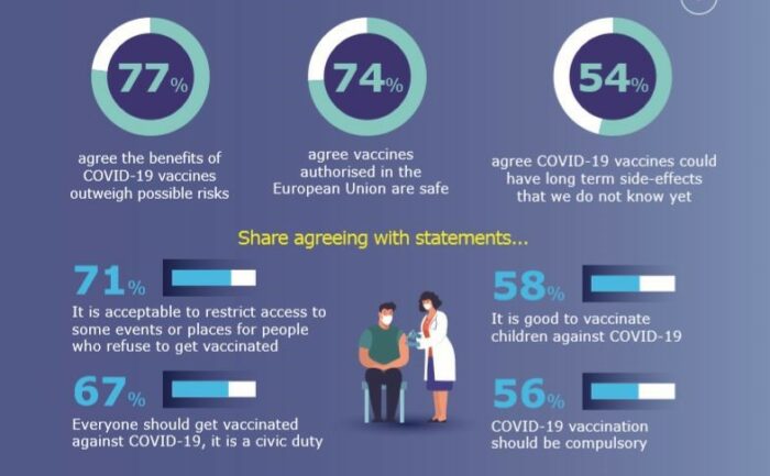 Même si les taux de vaccination contre la Covid-19 diffèrent selon les États, sur plus de 26.000 personnes interrogées dans l’UE, 82 % se sont déclarées favorables à la vaccination, ce qui signifie qu’elles ont été vaccinées et ont reçu une dose de rappel ou souhaitent en recevoir une. Ces personnes déjà vaccinées ont déclaré que se protéger elles-mêmes et protéger leurs proches contre des formes graves de maladie, l’hospitalisation et la mort étaient des facteurs importants qui les poussaient à se faire vacciner.