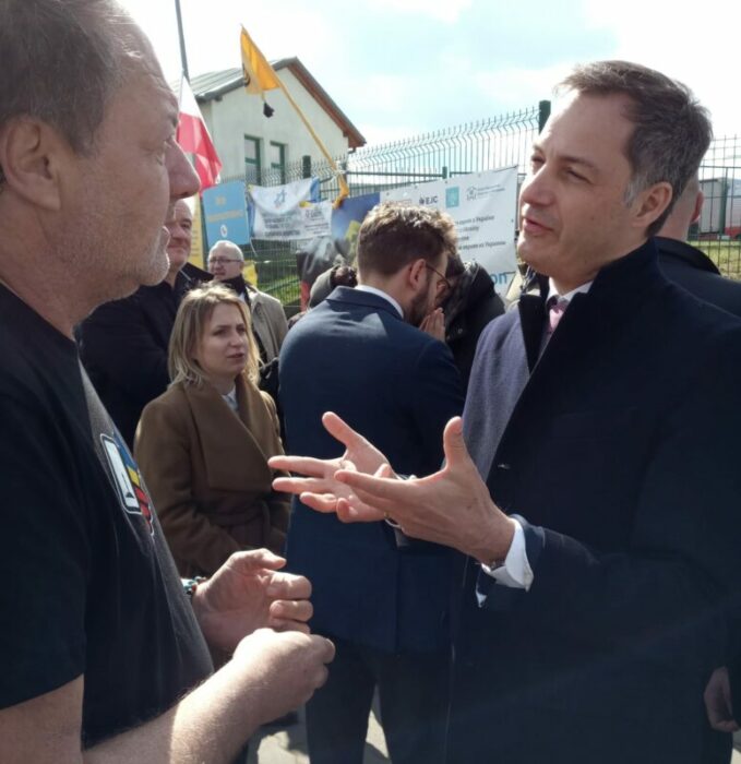 Alexander De Croo, à Médica, près du post-frontière discute avec Félix Derison, à la tête de l’ASBL Liège-Ukraine Solidarité