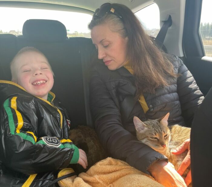 Sur l’immense parking entre coupé de tentes et de dons, des enfants jouent, le visage peinturluré du drapeau ukrainien. Artur, blondinet au regard azur nous sourit. Entouré de sa mère, de sa grand-mère et de leurs deux chats, il attend le top départ pour Liège.