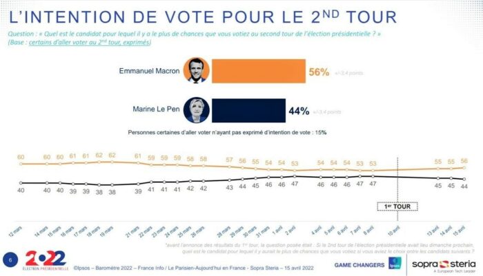 N’étant plus masquée par Éric Zemmour, Marine Le Pen se cristallise plus à l’extrême de la droite dans cet entre-deux-tours, ce qui impacte les sondages sur les intentions de vote (54% Macron/46% MLP ce 15 avril).