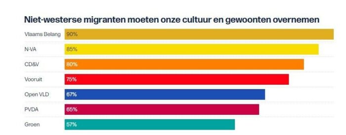 Il en ressort également que 76% des Flamands, les migrants non occidentaux doivent adopter notre culture et nos coutumes. Fait marquant : cet avis est également partagé par une majorité d’électeurs de gauche, qu’ils soient du Vooruit, de Groen ou même du PTB.