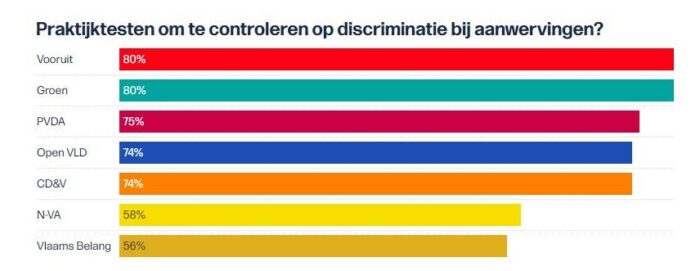 68 % des Flamands estiment que le gouvernement devrait organiser des tests pratiques pour lutter contre la discrimination à l’embauche. Il n’est pas surprenant que ce thème obtienne de bons résultats à gauche, mais il est également majoritaire à droite : 58 % chez les partisans de la N-VA et 56 % chez les électeurs du Vlaams Belang.