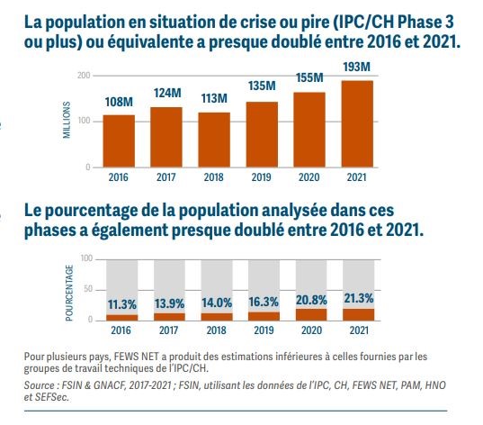 Si l’on compare les 39 pays/territoires restés en situation de crise alimentaire au cours des six éditions , soit de 2016 à 2021, le nombre de personnes en situation de crise ou pire (Phase 3 ou plus de l’IPC/CH) ou équivalente a quasiment doublé, passant de 94 millions à près de 180 millions d’individus.