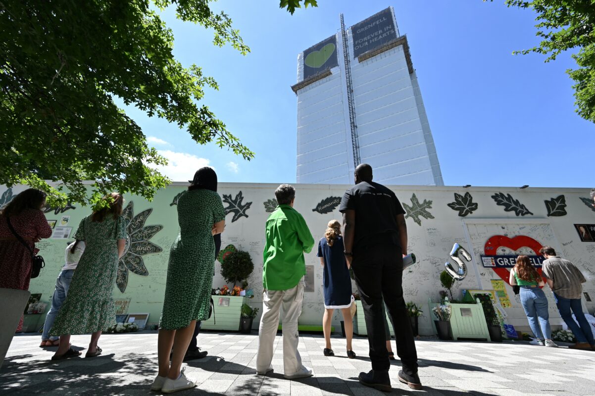 People gather in front of the makeshift memorial created on the wall surrounding Grenfell tower in west London, on June 14, 2022, on the fifth anniversary of the tragedy in order to pay their respect to the victims. - The names of the 72 people who perished in Britain's worst residential fire since World War II were read out on June 14, 2022 at a church service marking the fifth anniversary of the blaze. Survivors and families of the victims of the Grenfell Tower fire gathered at Westminster Abbey for the first of a day of events to remember the tragedy. (Photo by Glyn KIRK / AFP)