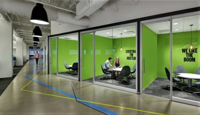 C’est ce même esprit de coopération et de stratégie qui est encouragé dans ce concept. Adapté au monde de l’entreprise, une Huddle Room est un petit salon de travail cloisonné capable d’accueillir entre 2 et 5 collaborateurs en moyenne. Le concept de cette bulle de travail ? Concentration, isolement, espace privé… Mais toujours bien équipé. Optimalement, cet espace est vitré et situé dans un lieu de passage au sein des locaux, afin de mettre l’accent sur des interactions spontanées et informelles avec les autres collaborateurs présents dans l’espace global.