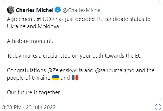 « Cette journée marque une étape cruciale sur votre chemin vers l’UE », a déclaré Charles Michel, sur Twitter, félicitant Volodymyr Zelensky et la présidente moldave Maïa Sandu, ainsi que leurs peuples. «Nous avons un avenir ensemble», a-t-il ajouté. Le chancelier allemand Olaf Scholz a qualifié ce Conseil européen, dont la France a la présidence tournante jusqu’au 30 juin, d’«historique».
