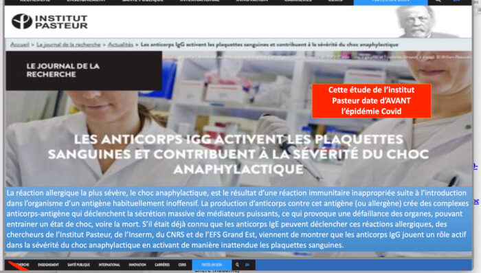 « Au courant du mois de septembre 2021, je partage sur son mur Facebook une étude parue sur le site internet de l’Institut Pasteur parue le 14 mai 2018 , au sujet du choc anaphylactique – forme d’allergie grave et potentiellement mortelle – qui est l’un des effets secondaires connus, documentés et étudiés de certains vaccins Covid-19 », poursuit-il.