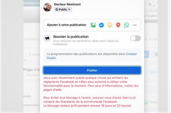 « Lorsque j’ai voulu, peu après, publier un nouveau contenu, j’ai constaté que son compte était à nouveau bloqué au motif que : « Vous avez récemment publié quelque chose qui enfreint les règlements Facebook et n’êtes plus autorisé à utiliser cette fonctionnalité pour le moment. Aucune autre précision n’a été fournie : quel contenu précis ne correspond pas aux standards de la communauté ? Quelle règle enfreinte ? »