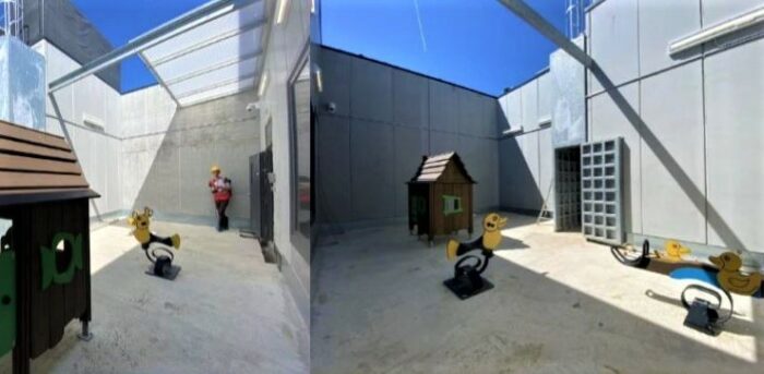 Copyright – La cour pour enfants aménagée au sein de l’unité visite – Rapport du CCSP à la suite de la seconde visite du site en construction de la prison de Haren (13.06.22)
