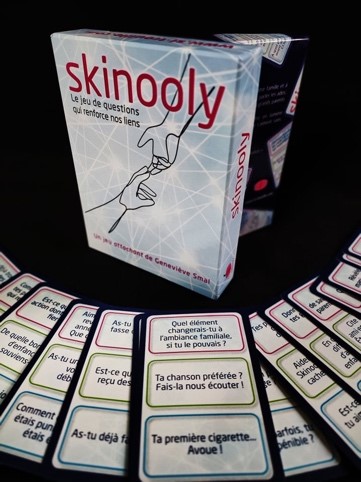 Skinooly, ça vous parle ? Il s’agit d’une composé de 159 questions pour mettre en lumière les connexions de celles et ceux qui s’aiment sans (parfois) oser se le dire. Skinooly, c’est un jeu coopératif, convivial, qui fait du bien à la famille et aux soirées entre amis ou juste aux rencontres de simples relations. Un jeu qui participe à resserrer les liens, à faire parler les ados, et à faire se dévoiler délicatement les parents et les grands-parents. En un mot, Skinooly est attachant. Envie d’en savoir plus? Explication avec la conceptrice de ce sémillant moment de détente intelligent, Geneviève Smal, créatrice, entre autres, de Si-Trouille Éditions.