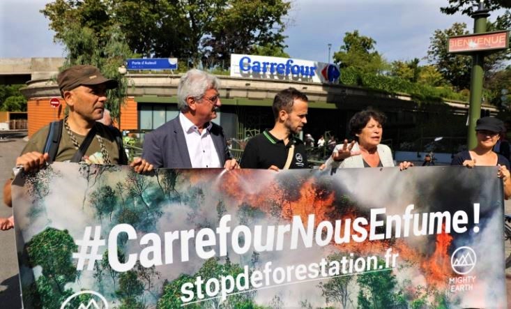 Pour inviter à la signature d’une pétition, des militants de l’association, accompagnés notamment de l’eurodéputée Michèle Rivasi, ont déployé une banderole « CarrefourNousEnfume ! » devant un magasin parisien de l’enseigne. #CarrefourNousEnfume. C’est le nom de la grande campagne lancée ce 5 septembre sur les réseaux sociaux, par Mighty Earth.