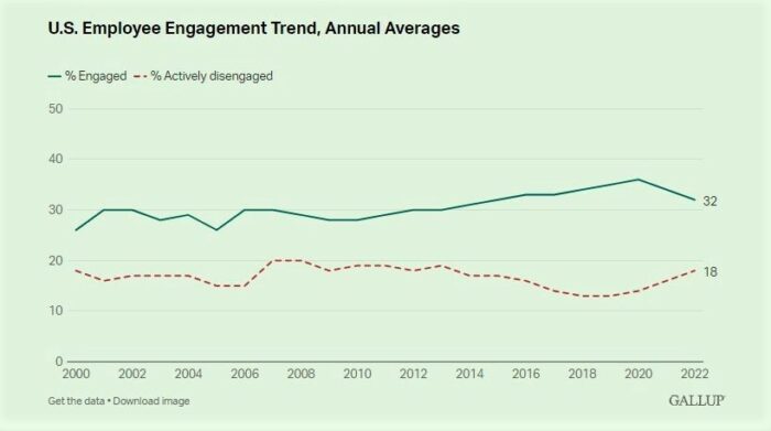 Selon l’étude réalisée par Gallup, l’engagement des employés américains a encore reculé au cours du deuxième trimestre de 2022, la proportion de travailleurs engagés restant à 32% mais la proportion de travailleurs activement désengagés augmentant à 18%.