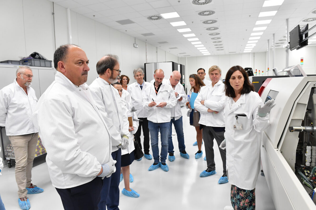 Le vice-ministre-président wallon Willy Borsus est photographié, en compagnie du CEO Julien Compère, lors de l'inauguration de la nouvelle ligne de production de cartes électroniques du groupe Herstal en juin dernier. BELGA