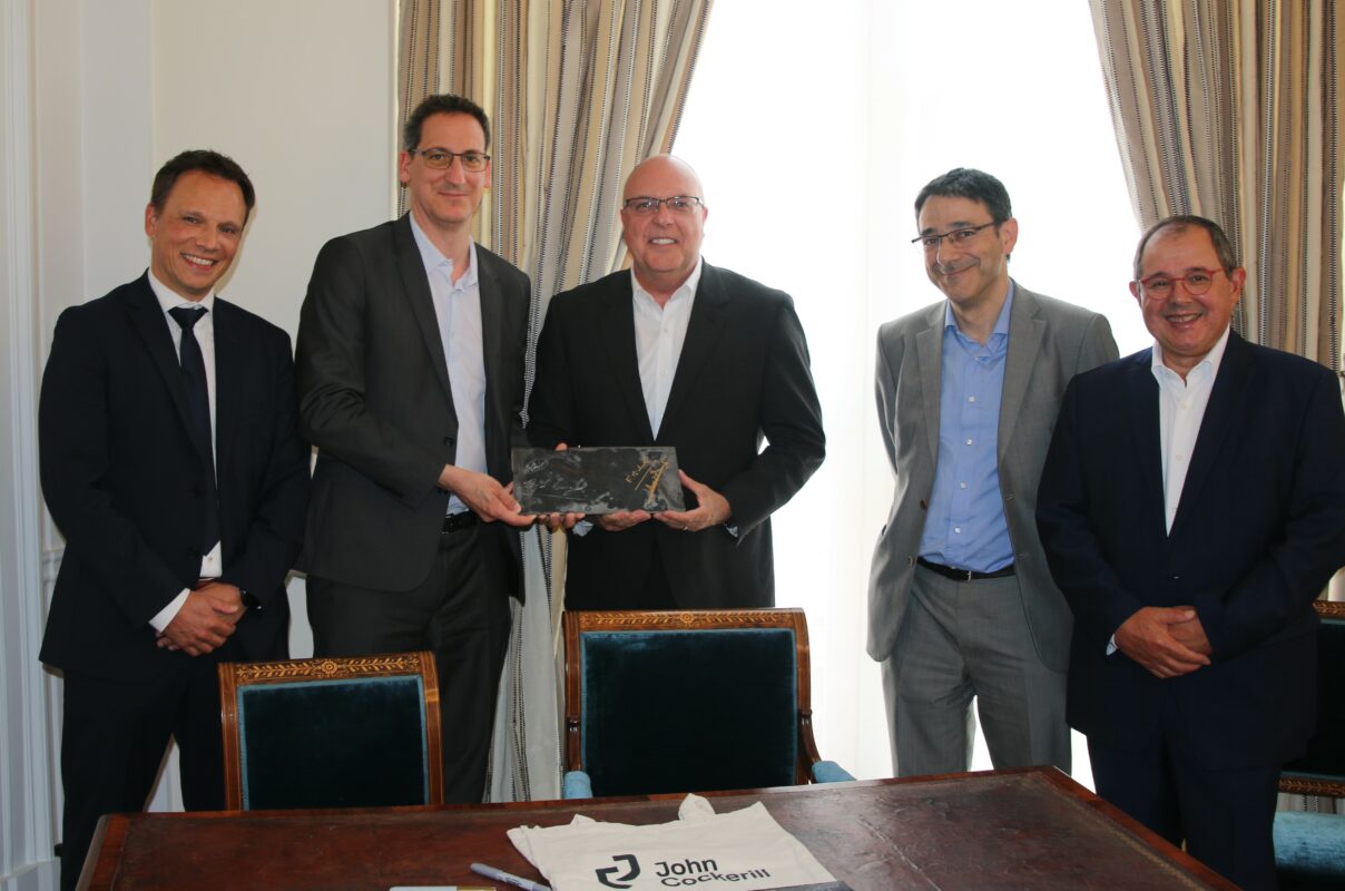 De gauche à droite: Sebastien Roussel (président de John Cockerill Industry), Francois Michel (CEO de John Cockerill group), Brad Davey (responsable de l'optimisation des processus chez ArcelorMittal), Pedro Pendes, Joao Felix Da Silva (conseiller du président de John Cockerill, Bernard Serin). Photo John Cockerill Leader dans le développement d’installations de traitement d’acier et d’électrolyseurs, John Cockerill et ArcelorMittal, premier producteur d’acier au monde ont signé un partenariat visant à construire la première usine d’électrolyse du fer à basse température à l’échelle industrielle. Le nouveau procédé mis au point par les deux groupes permettra de décarbonner la production de l’acier qui supplantera la production d’acier au départ des hauts-fourneaux. L’usine Volteron sera opérationnelle en 2027, elle produira, dans un premier temps, entre 40.000 et 80.000 tonnes de plaques de fer par an avant de monter en puissance pour atteindre entre 300.000 et un million de tonnes. Le choix de l’implantation de Volteron reste encore à trouver. Il dépendra de plusieurs facteurs.