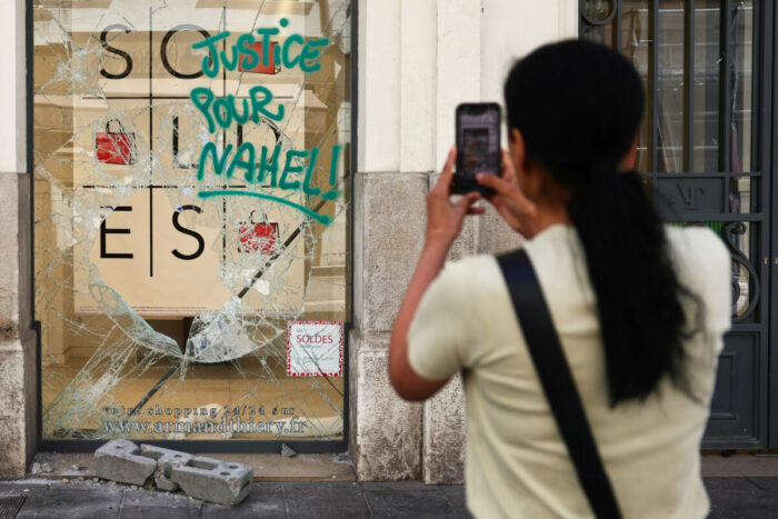 AFP Un piéton utilise un smartphone pour filmer la façade d’un magasin endommagé avec un message indiquant « Justice pour Nahel » à Marseille, dans le sud de la France, le 1er juillet 2023, après une quatrième nuit consécutive d’émeutes en France suite au meurtre d’un adolescent par la police. (AFP)