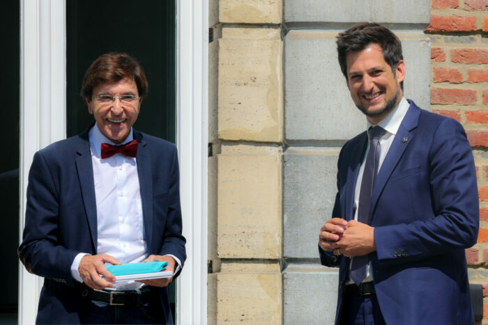 Le ministre-Président wallon, Adrien Dolimont (à droite sur la photo), et son prédécesseur, Elio Di Rupo (à gauche), le jour de la passation de témoin au siège du Gouvernement wallon à Namur le 14 juillet 2024. (Photo Philippe BOURGUET / bePress Photo Agency/bppa).