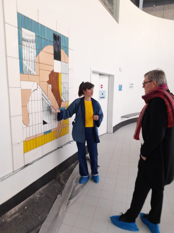 Cette céramique murale est constituée de 182 pièces de couleurs différenciées en grès et en porcelaine émaillées. Elle propose in situ une illustration vive de la liberté d’être et de nager et s’intègre à ce titre parfaitement au contexte du site.