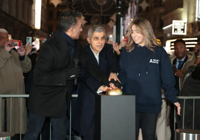 Lancement des illuminations dans le West End de Londres pour le début du Ramadan hier soir, ici le maire de Londres, Sadiq Khan avec, à droite, Rahima Aziz BEM de la Fondation Aziz, qui soutien cette initiative lancée de Aisha Desai, fondatrice de Ramadan Lights Crédit : Fondation Aziz.