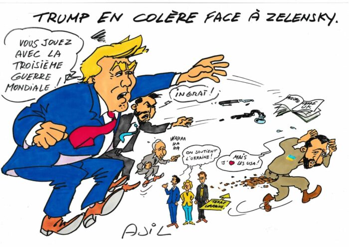 CARICACTURE L’oeil d’Ajil sur l’humiliation de Zelensky à la Maison Blanche Publié le samedi 01 mars 2025 à 21:47 | Temps de lecture estimé : < 1 min. 0 Likes Share