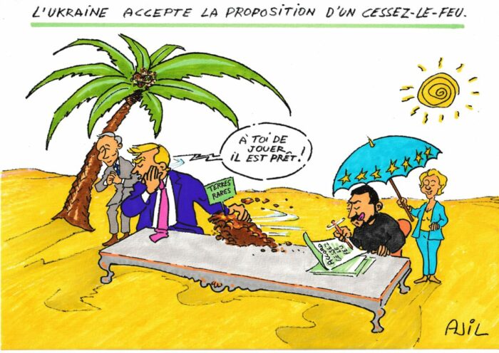 CARICATURE L’oeil d’Ajil sur l’accord de cessez-le-feu en vue entre l’Ukraine et la Russie Publié le mercredi 12 mars 2025 à 21:19 | Temps de lecture estimé : < 1 min. 0 Likes Share