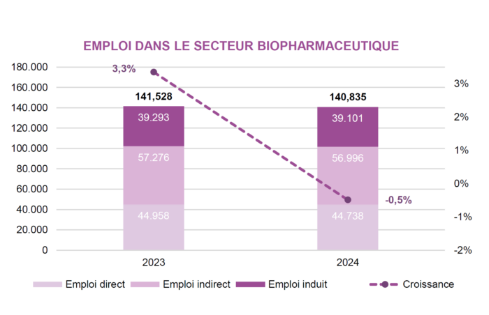 Ce retournement entraîne des répercussions en chaîne. Chaque emploi direct dans le secteur biopharma génère, selon pharma.be, trois emplois supplémentaires dans l’écosystème industriel et scientifique belge. Le ralentissement est donc loin d’être anodin pour le tissu économique national. L’emploi direct est passé de 44.958 collaborateurs en 2023 à 44.738 personnes en 2024. Les emplois indirects et induits enregistrent des diminutions (voir infographie).