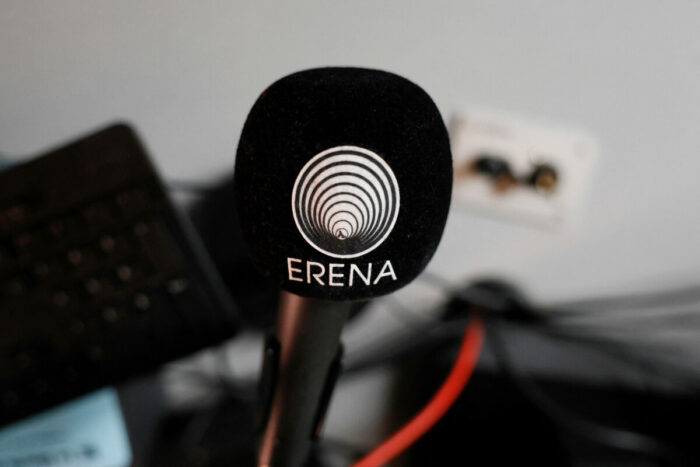 AFP Cette photographie montre un microphone portant le logo d’Erena radio Erythree International à Paris, le 31 octobre 2024. Depuis un minuscule studio niché dans un appartement parisien, les puissantes ondes de Radio Erena s’élèvent. Seul média indépendant disponible dans le trou noir de l’information qu’est l’Érythrée, la station était menacée de disparition en octobre 2024 faute de financement après quinze ans d’existence. (Photo par Gregoire CAMPIONE / AFP)