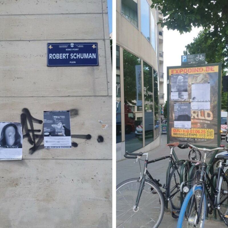 Entre vendredi et dimanche, en plusieurs vagues successives, des affiches ont été placardées autour du rond-point Schuman où sont situés plusieurs bâtiments de la Commission européenne, celui du Conseil et celui du Service Européen d’Action Extérieure (SEAE, le « ministère des affaires étrangères de l’U.E.). Nous avons flouté les photos sur les affiches pour éviter qu'on les reconnaisse.
