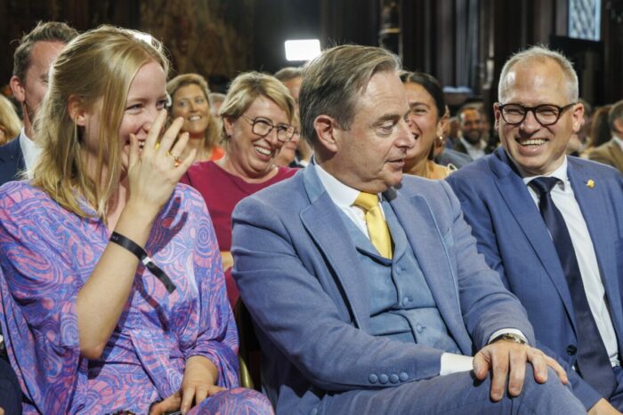 BELGA A l’avant-plan, ministre flamande du Logement et de l’Énergie Melissa Depraetere (Vooruit); le Premier ministre, Bart De Wever (N-VA) et le ministre-Président flamand, Matthias Diependaele (N-VA), photographiés lors d’une réception à l’Hôtel de Ville de Bruxelles, dans le cadre des célébrations à l’occasion de la fête régionale flamande, le vendredi 11 juillet 2025. (BELGA PHOTO NICOLAS MAETERLINCK).