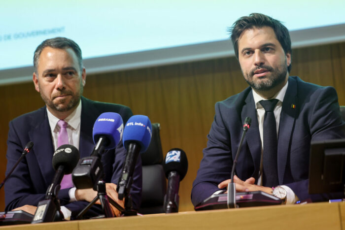 bePress Photo Agency / BOURGUET L’ancien président des Engagés, Maxime Prévot, devenu vice-Premier ministre et ministre des Affaires étrangères, et Georges-Louis Bouchez, président du MR. Les deux partis sont les seuls membres francophones de la majorité fédérale. (Photo Philippe BOURGUET / bePress Photo Agency/bppa).