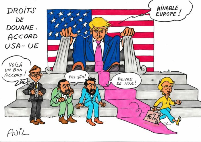 CARICATURE Droits de douane : l’oeil d’AJIL sur l’accord de UE-USA Publié le mardi 29 juillet 2025 à 22:13 | Temps de lecture estimé : < 1 min. 0 Likes Share