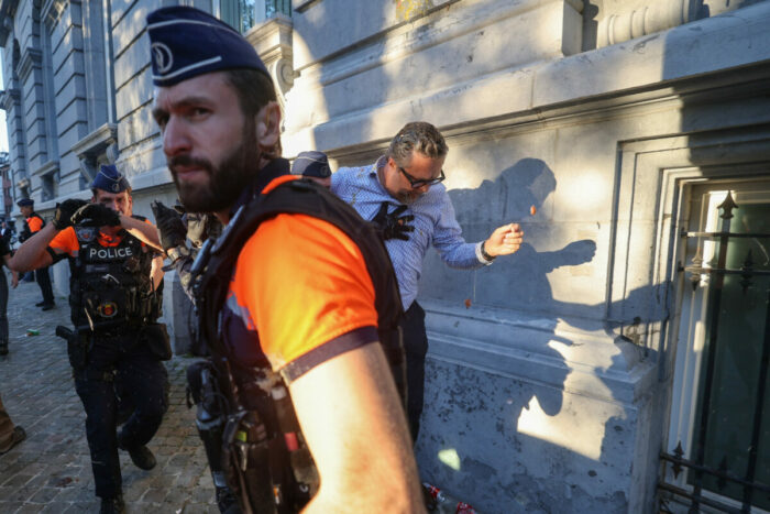 Devant l’entrée principale, sur la place du 20 Août, il y a eu, par moments des bousculades. Pris à parti par des manifestants, des membres du MR venus assister à la cérémonie d’hommage à Jean Gol se sont réfugiés précipitamment dans le Théâtre de Liège, situé juste en face de la place du 20 Août. De son côté, Georges-Louis Bouchez a accédé au bâtiment abritant la salle académique par une porte dérobée en hauteur, sous la protection des policiers.