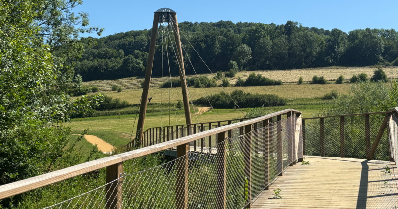 C’est désormais fonctionnel. La passerelle haubanée, surnommée « bat-bridge », franchit le Ton à proximité de la frontière française à Lamorteau. D’une longueur totale de 68 mètres, elle relie les deux rives, vers Torgny, dans le respect du paysage et de la faune locale. Sa structure en bois local, ses rampes accessibles et son plancher antidérapant garantissent sécurité et intégration.
