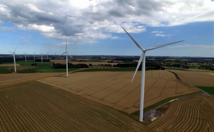 Vue aérienne d’un parc éolien à Seneffe (en région wallone). (BELGA PHOTO ERIC LALMAND)