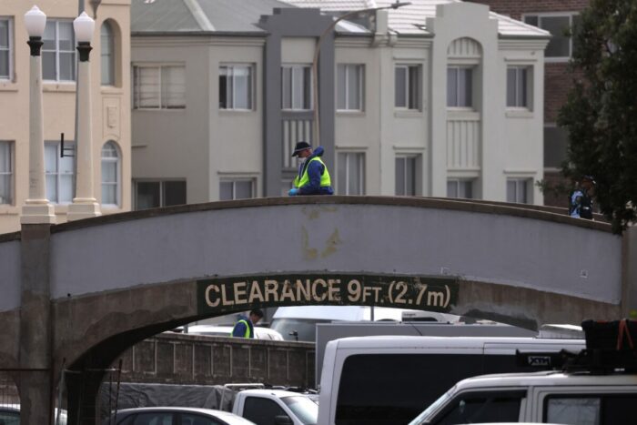 Le 15 décembre 2025, la police inspecte les lieux d’une fusillade à Bondi Beach, à Sydney. (DAVID GRAY / AFP).