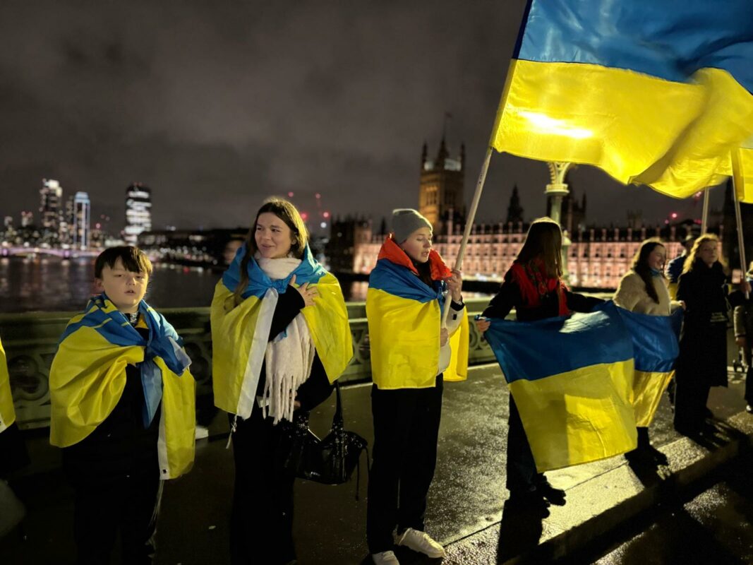 (Des Ukrainiens ont manifesté jeudi soir pour la journée de l’unité près du pont de Westminster à Londres. Photo : Alexander Seale).