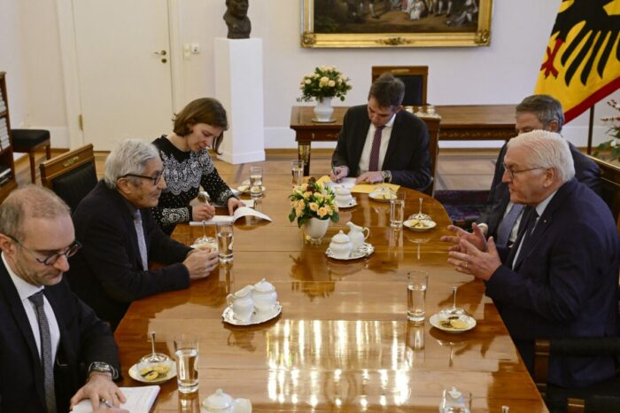 L’écrivain français Boualem Sansal (à gauche) rencontre le président allemand Frank-Walter Steinmeier (à droite) au palais présidentiel de Berlin, le 8 janvier 2026. (John MACDOUGALL / POOL / AFP).
