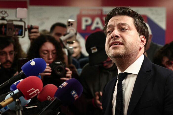 Benoît Payan, maire sortant de Marseille et candidat de la coalition de gauche « Printemps Marseillais » à sa réélection, s’exprime après l’annonce des résultats du premier tour des élections municipales françaises de 2026 à Marseille, dans le sud de la France, le 15 mars 2026. (Thibaud MORITZ / AFP).