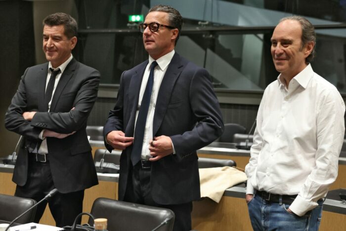 (De gauche à droite) Matthieu Pigasse, fondateur du groupe de presse Combat, Jérôme Nomme, président de KKR France, et Xavier Niel, fondateur d’Iliad et de Free, tous actionnaires du groupe de production audiovisuelle Mediawan, posent avant une audition devant la Commission d’enquête sur la neutralité, le fonctionnement et le financement de l’audiovisuel public à l’Assemblée nationale à Paris, le 2 avril 2026. (ALAIN JOCARD / AFP).