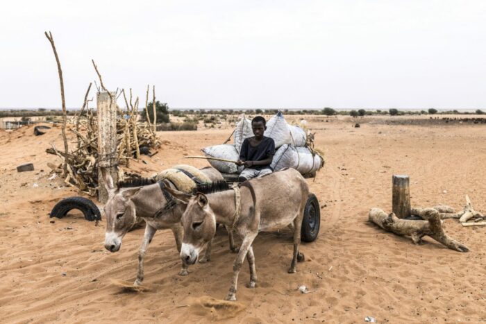 Un réfugié voyage dans une charrette tirée par un âne au camp de réfugiés de M’berra, qui accueille 120 000 personnes fuyant les violences et l’instabilité au Mali, dans la région de Hodh Ech Chargui en Mauritanie, le 27 avril 2026. Des milliers de personnes ont péri dans des attaques au Mali depuis le début de la crise djihadiste et des dizaines de milliers de Maliens ont cherché refuge dans les pays voisins, notamment en Mauritanie, ces dernières années. (PATRICK MEINHARDT / AFP).